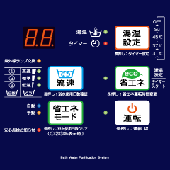 浴水を清潔に保つため、紫外線ランプの交換時期をランプでお知らせします。   操作パネルランプ点灯イメージ
